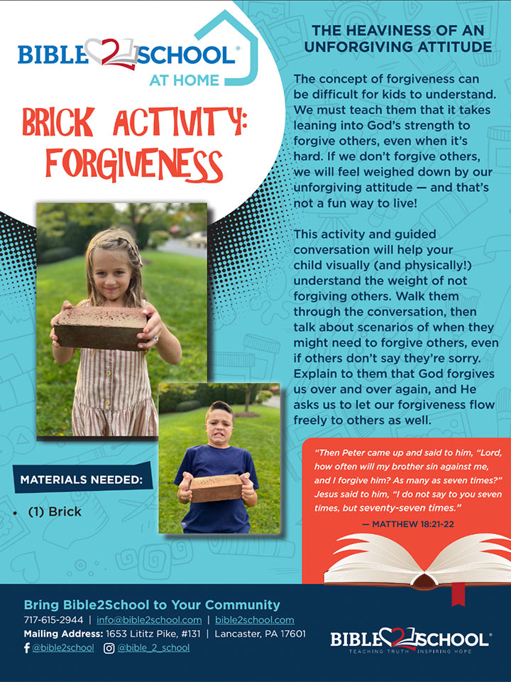 This activity and guided conversation will help your child visually (and physically!) understand the weight of not forgiving others. Walk them through the conversation, then talk about scenarios of when they might need to forgive others, even if others don’t say they’re sorry. Explain to them that God forgives us over and over again, and He asks us to let our forgiveness flow freely to others as well.
